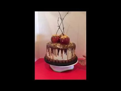 This is a Halloween themed Snickers cake made from chocolate cake filled with salted caramel buttercream and nougat, iced with salted caramel buttercream and topped with chocolate ganache and caramel. Caramel coated apples and twigs were added for a spooky feel.
